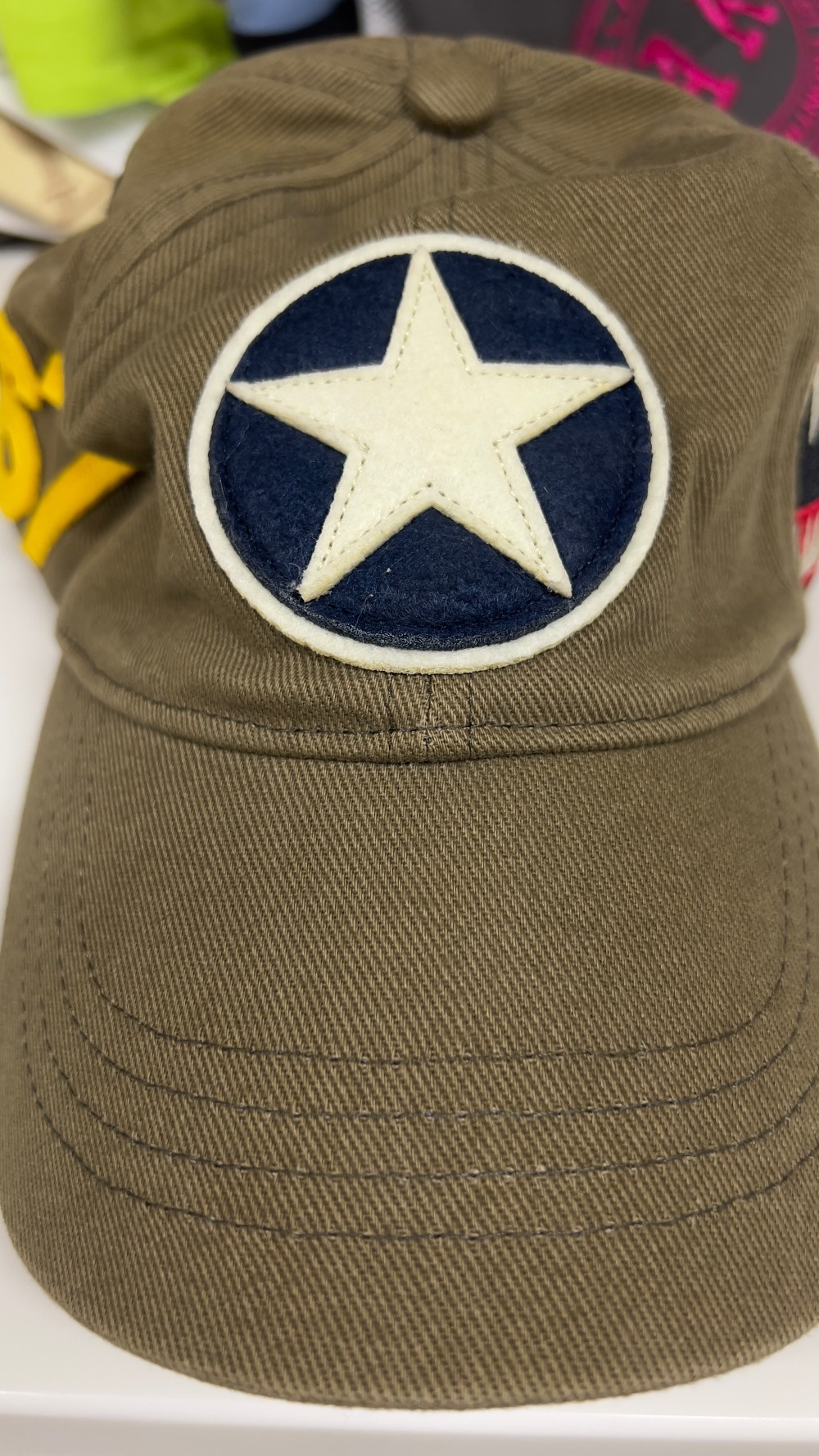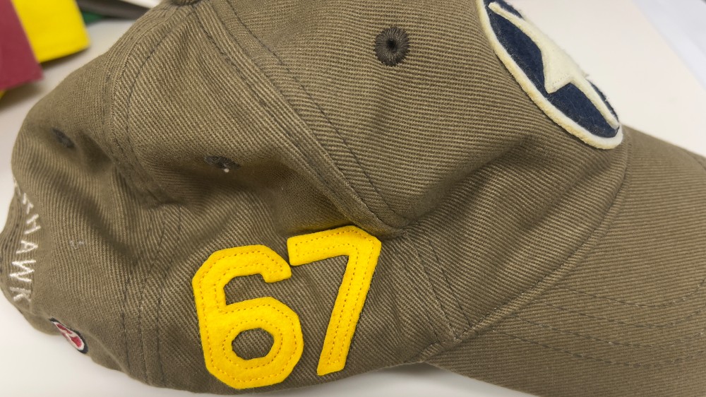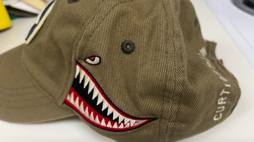 Green and white cap with P40 Warhawk airplane.
