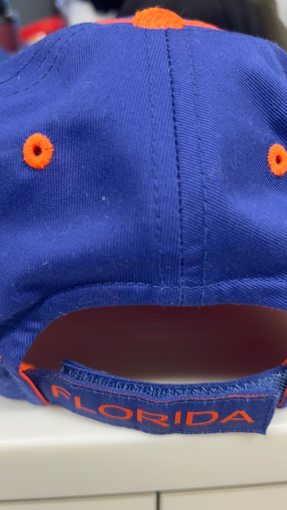 Cap, University of Florida Gators. Blue, orange with Gators logo in green, orange, white and black.